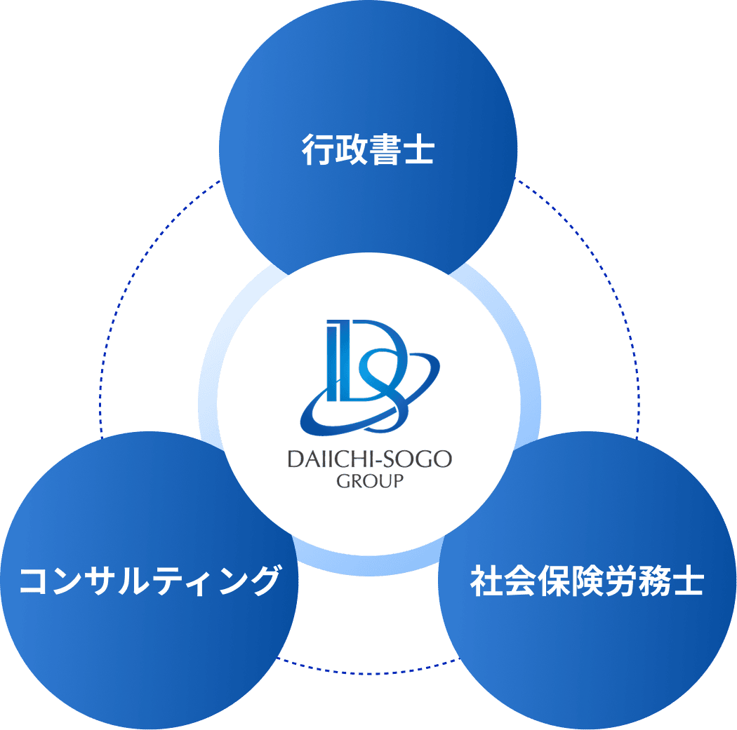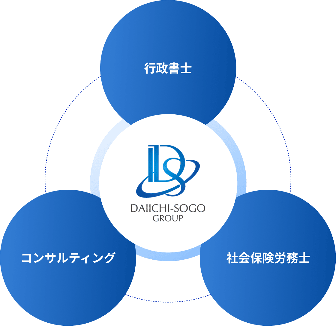 第一綜合グループは,行政書士・社会保険労務士・コンサルティングの3つの分野で事業を展開しています。